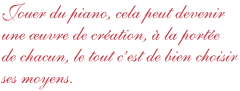 Le piano est un instrument-orchestre qui se met au diapason de tous les goûts et de toutes les époques. Que l’on ait envie de jouer une sonate de Mozart, le dernier tube de Lady Gaga, un menuet de Bach, une chanson des Beatles, Thelonious ou la Chevauchée Fantastique, le travail reste le même : apprendre à connaître le clavier, apprendre à y mettre ses doigts, développer une connaissance tactile du clavier, lire la partition et .... démarrer !